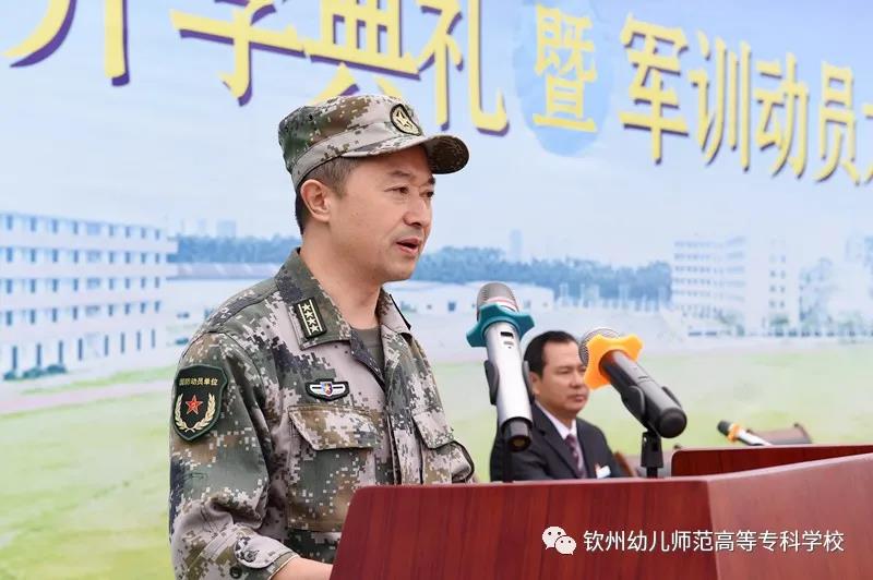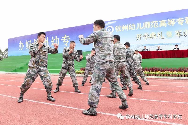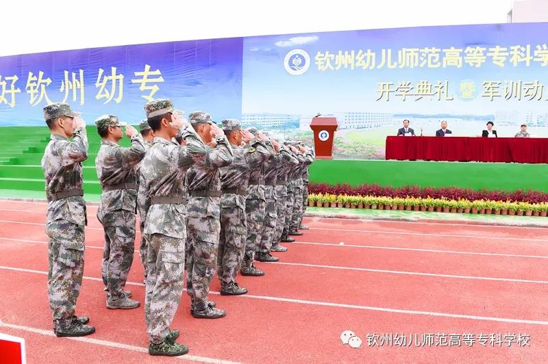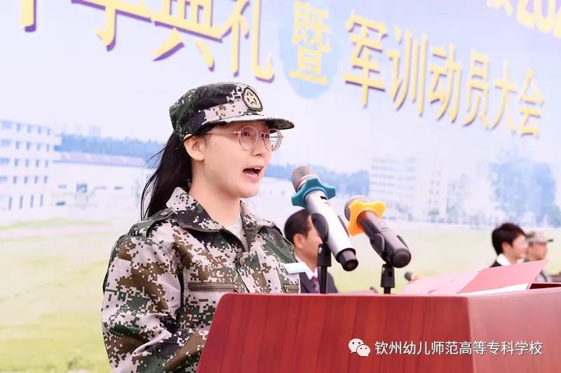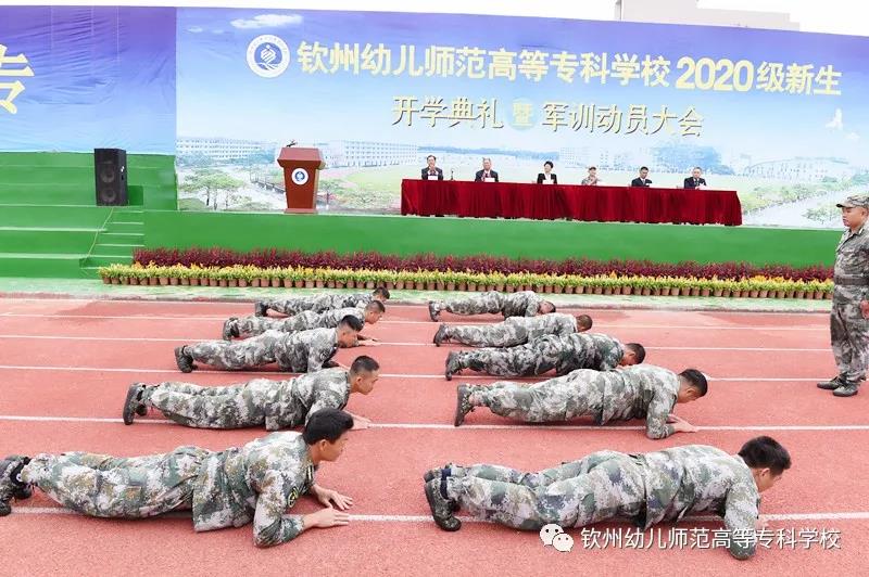 梁校长宣布钦州幼儿师范高等专科学校2020级新生开学典礼暨军训动员大会结束,各教官组织各班开始军训!
