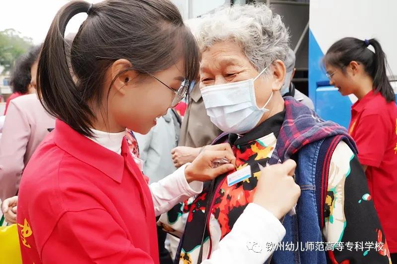 学生志愿者给来访离退休教职工佩戴钦州幼专?;?/p>