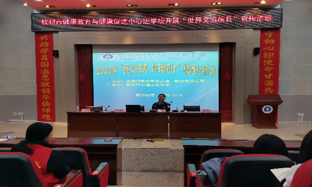 为切实履行高校艾滋病防控宣传教育职责,有效提高学生艾滋病防控知识知晓率和自我?;ひ馐?,2020年12月4日由共青团钦州市委员会与钦州市教育局主办,钦州市心理卫生协会承办的“抗艾知宪,你我同行”校园防艾宣传与法治教育讲座在钦州幼儿师范高等专科学校5号教学楼东报告厅开展。