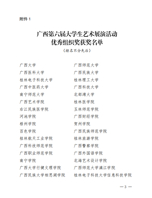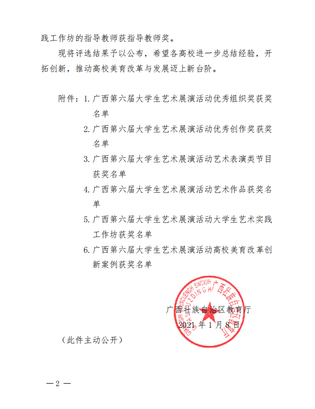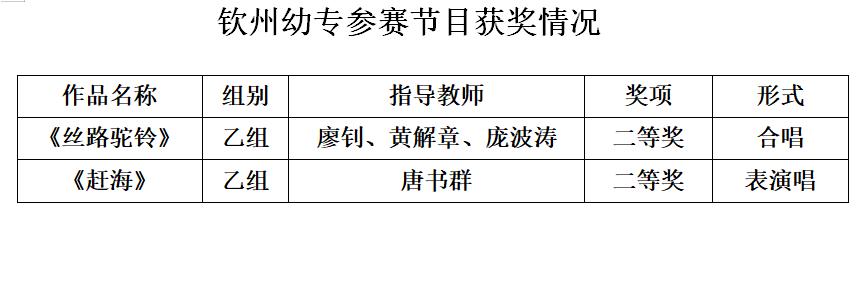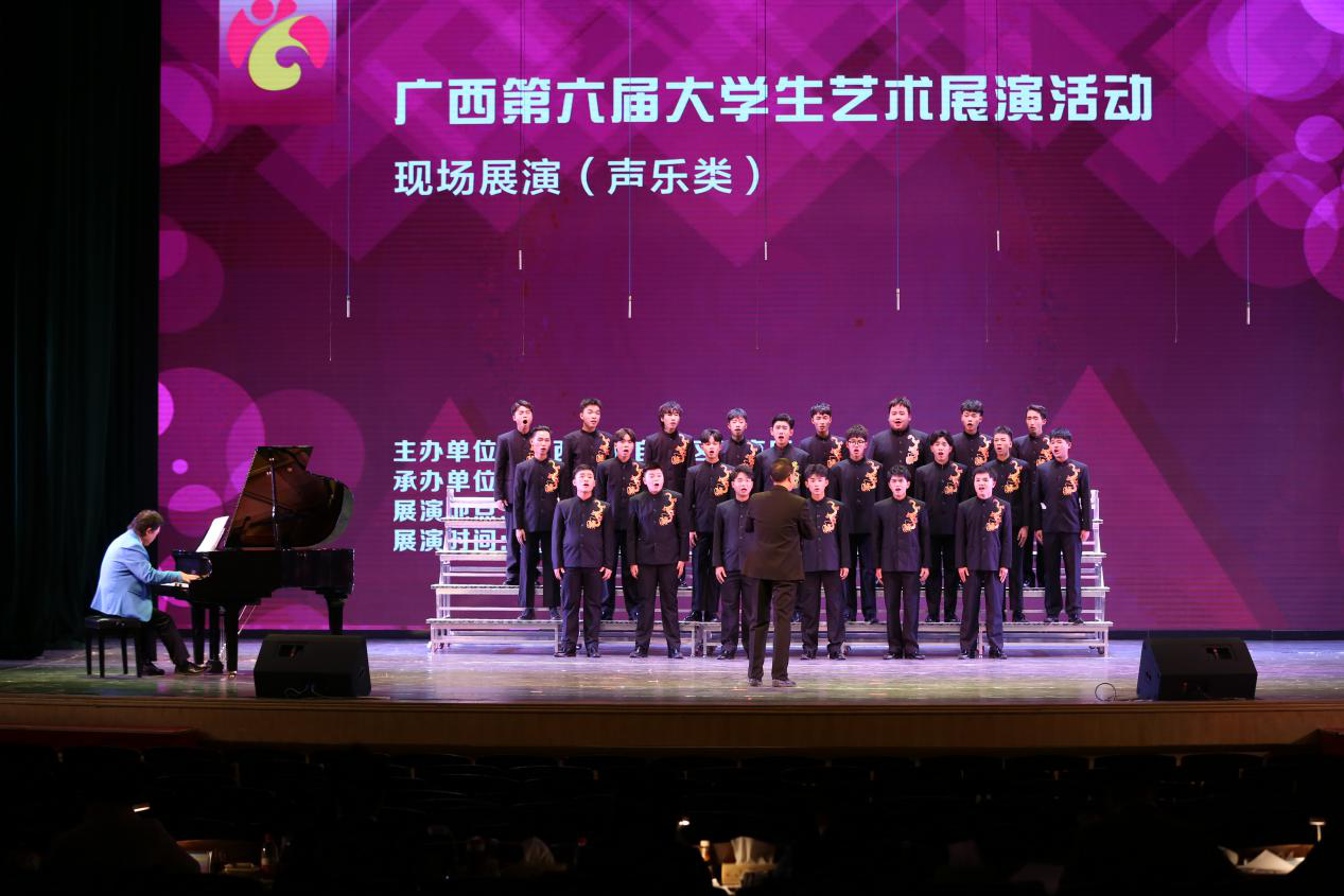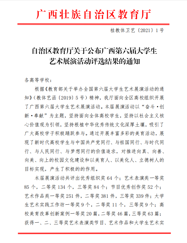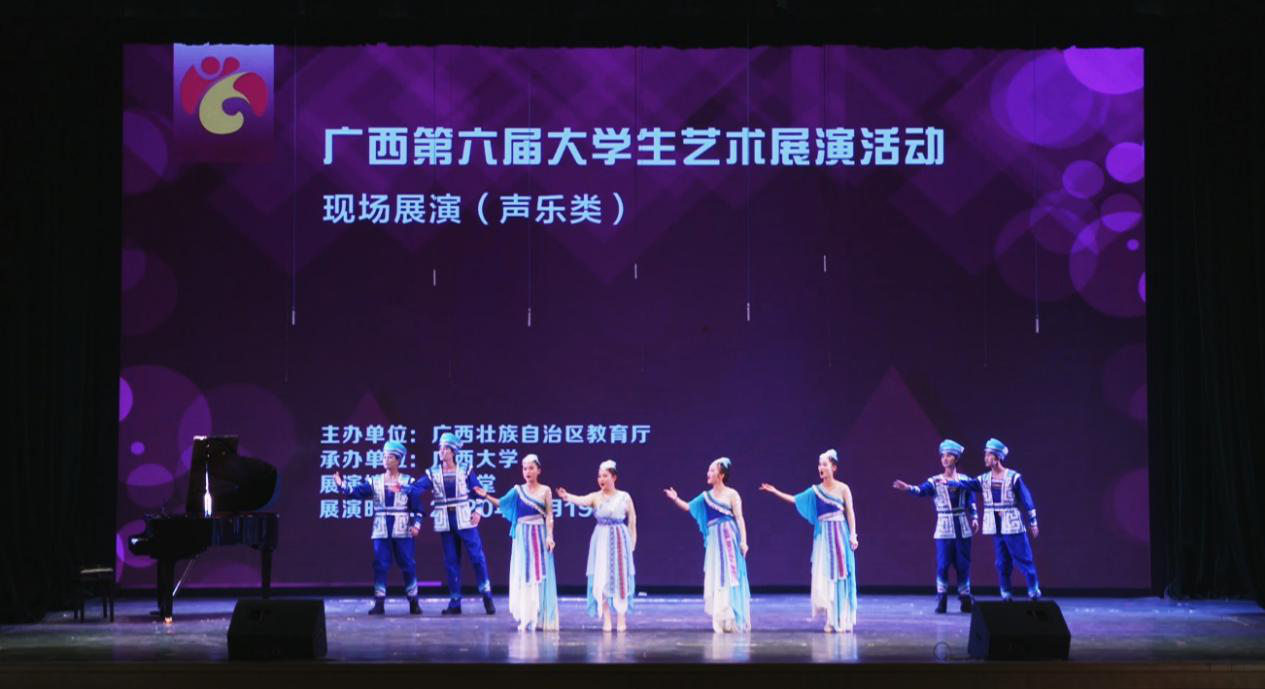 2020年12月19日,由广西壮族自治区教育厅主办、广西大学承办的广西第六届大学生艺术展演活动隆重启幕。在校领导的大力支持下,我校艺术系报送的声乐节目合唱《丝路驼铃》、表演唱《赶海》从全区64所高校的共计303件艺术表演类作品初评中脱颖而出,入围本次现场展演,经过激烈的角逐,我校报送的两个节目均获得了声乐类乙组(专业组)二等奖,学校获得优秀组织奖。