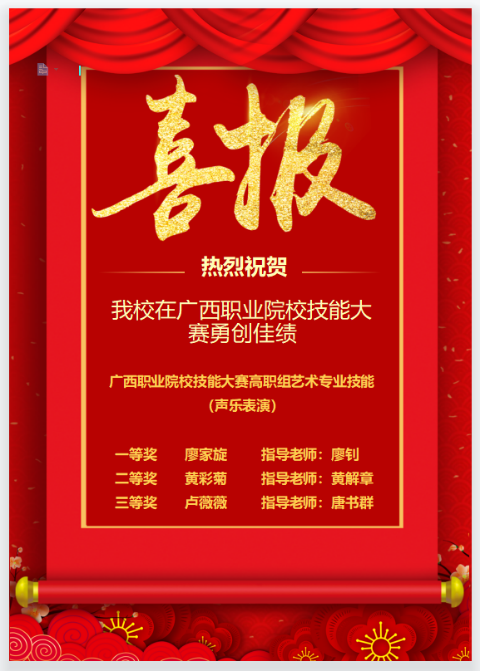 这是我校学生第一次在省级专业技能比赛中获得一等奖,也是继去年11月获得第六届广西大学生艺术展演声乐类乙组(专业组)二等奖以来取得的又一次省级专业赛事大奖。向各全区各兄弟院校展现了我校学生良好的精神面貌和较高的职业素养,体现了我校在专业建设、人才培养以及教育教学改革的成效。