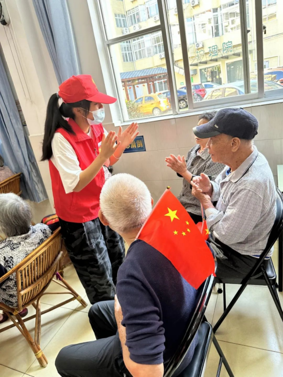 接着,志愿者演唱的经典红歌《没有共产党就没有新中国》引起了老人们的共鸣。最后大家一起合唱《我和我的祖国》,将现场的氛围推向了高潮。