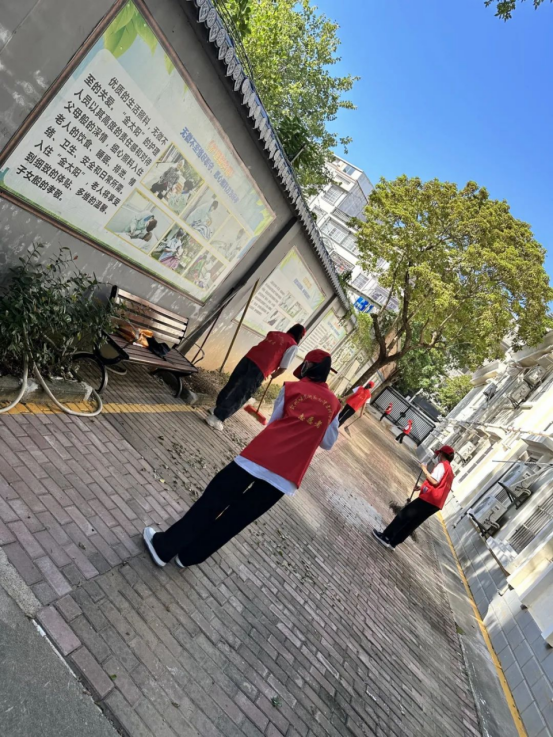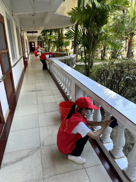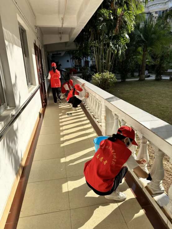 志愿者们在康养中心清洁打扫,擦拭走廊,养护绿化,让老人们能在更加舒适干净的环境中颐养天年。