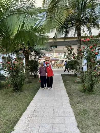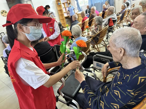 志愿者们贴心询问老人们的健康情况,提醒天气降温注意添衣。心艺手工社团的成员还提前制作了手工花朵送给老人们,传递温暖与爱。志愿者搀扶着老人,散步聊天,享受着秋日午后阳光。