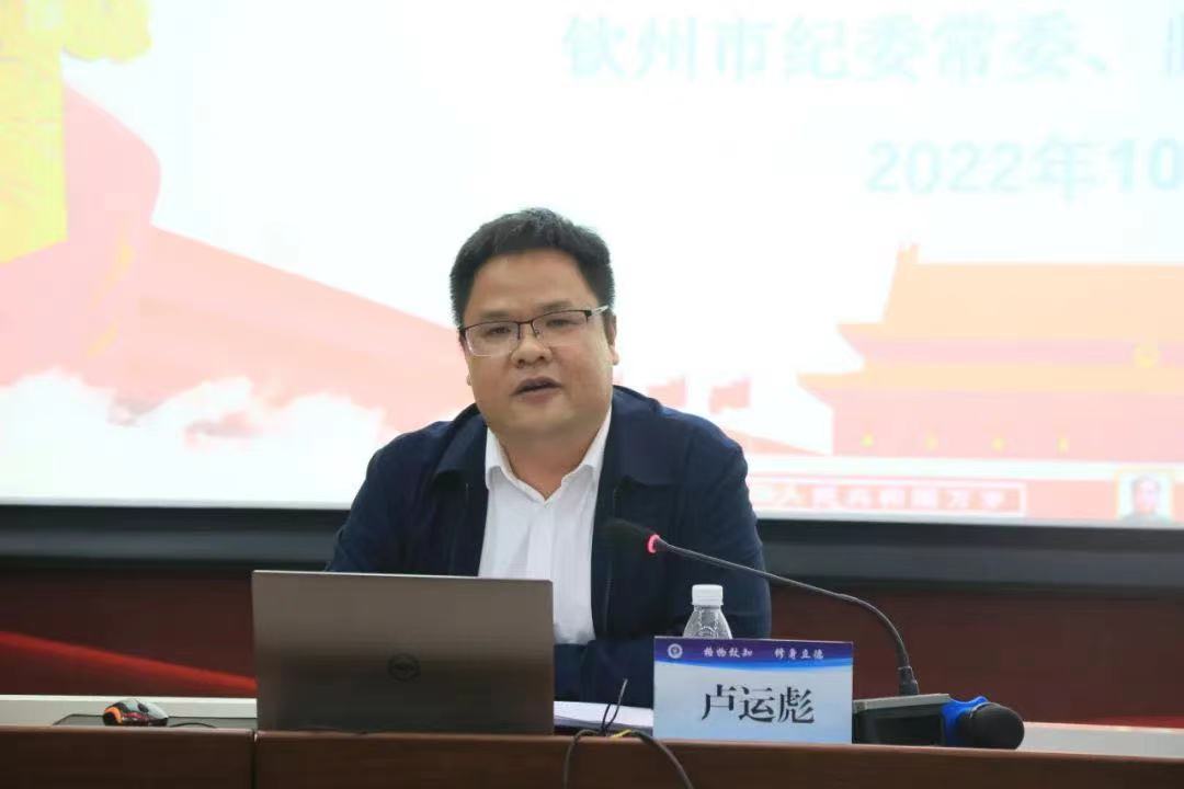 为认真贯彻落实党的二十大精神,扎实推进清廉学校建设, 10月19日下午,我校举办第二场"廉洁从政,廉洁从教"专题培训讲座,邀请了钦州市纪委常委、监察委委员卢运彪到我校进行专题授课。讲座由学校党委书记田茂群主持。学校中层以上党员领导干部聆听了讲座。