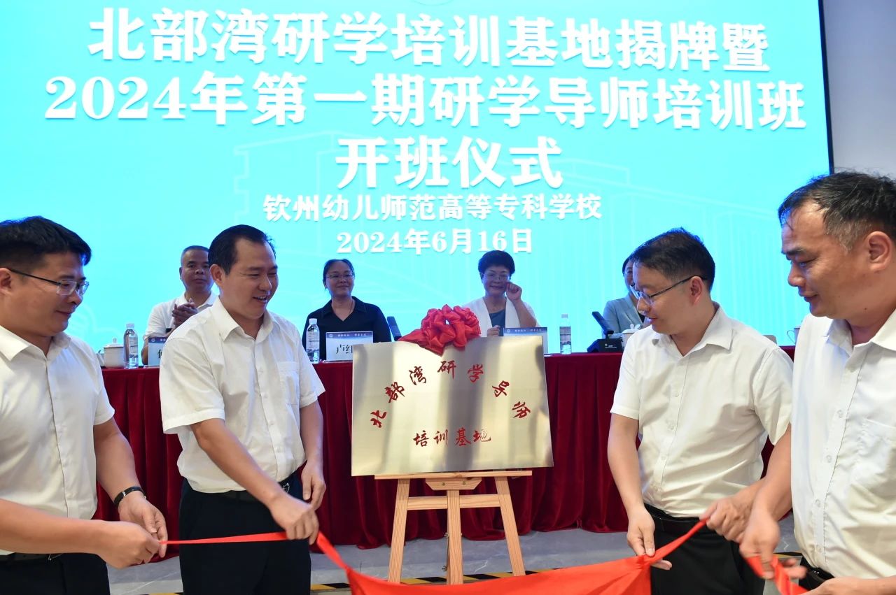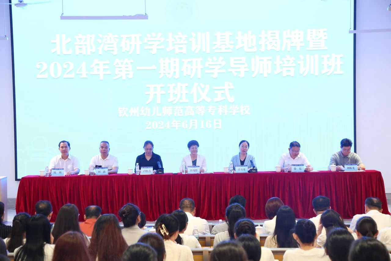 6月16日上午,北部湾研学导师培训基地揭牌暨2024年钦州幼儿师范高等专科学校第一期研学导师培训班开班仪式在我校成功举行。市教育局党组成员、副局长,校党委书记田茂群,市教育局党组成员、副局长梁月英,市教育发展研究中心副主任徐东等领导出席活动。各县区教育局分管领导、部分市直中小学校长及幼儿园园长、相关研学旅行企业代表、全体培训班学员参加了本次活动?;疃尚5澄笔榧?、校长卢红青主持。