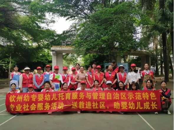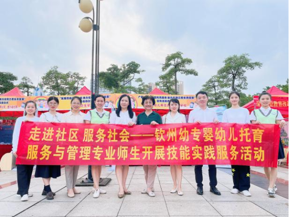 婴幼儿托育服务与管理专业充分发挥资源优势,积极主动开展社会服务工作。2023年5月,婴托专业教师到来宾参加自治区卫健委主办的“发展普惠托育服务 助力实施三孩生育政策”宣传活动,通过发放政策宣传手册、专业咨询讲解,展示婴幼儿照护技能、生活照料技能、婴幼儿抚触技能、绘本阅读指导等方式向群众全面宣传婴幼儿照护政策、三孩政策和我校专业办学情况及办学水平。2023年6月,婴托专业教师到钦州市钦南区南珠街道高岭社区开展送教进社区活动,开展了专业技能展示以及三胎政策宣传等活动。