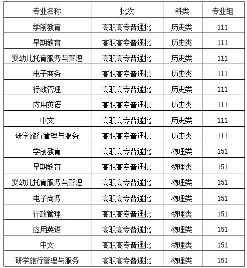 学前教育、早期教育、婴幼儿托育服务与管理、电子商务、行政管理、应用英语、中文、研学旅行管理与服务等8个专业为普通类专业。学校以“分数优先、遵循志愿”为原则,对进档考生按投档成绩从高到低进行排序,结合考生填报的专业志愿进行专业安排。根据考生填报的专业志愿顺序,按第一专业志愿录取,不能满足的,按其第二专业志愿录取,依次类推??忌凶ㄒ抵驹付嘉薹闶?,若服从专业调剂,则在全部有专业志愿考生录取分档完毕后,再将所有未录取且服从专业调剂的考生按从高分到低分排序调剂到其他尚未录满的专业,不服从调剂的,作退档处理。对调剂录取和退档的考生,本校不再征求考生意见。