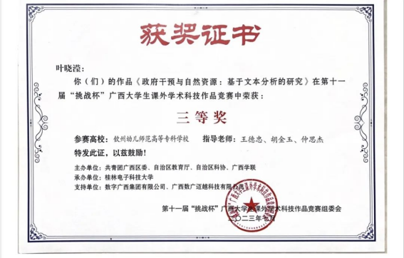 Δ2023年第十一届“挑战杯”广西大学生课外学术科技作品竞赛三等奖