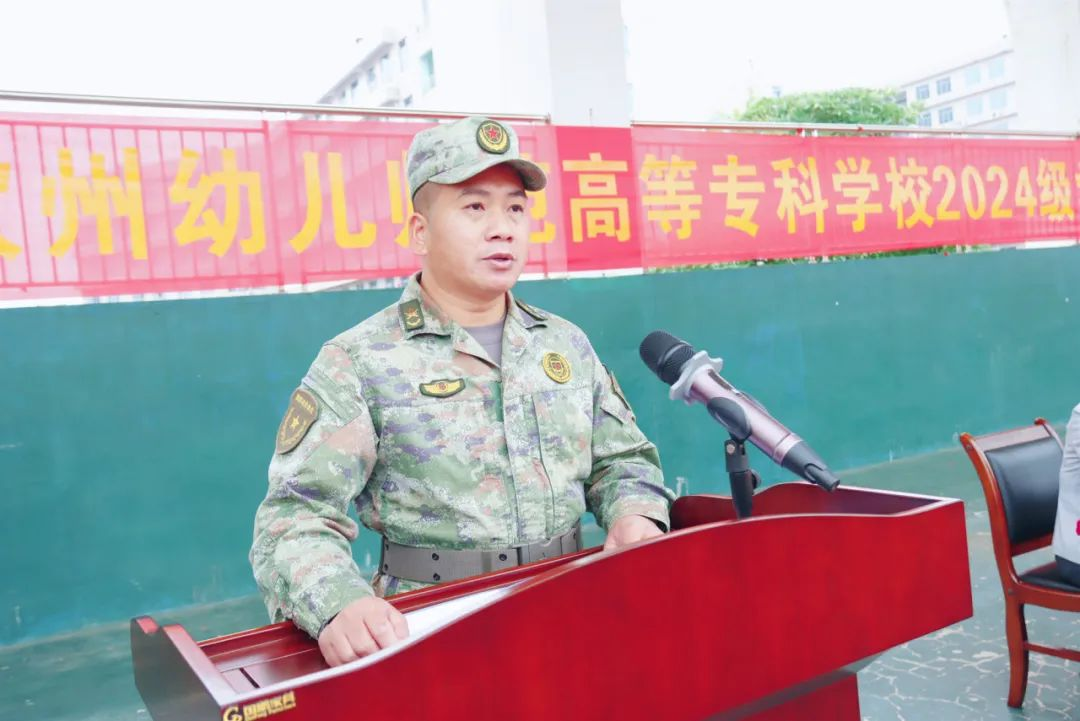 承训教官代表农积金对全体承训教官提出科学训练、精心组织、尽职尽责,以饱满的精神状态和良好军人形象做好表率的要求,并希望同学们通过军训勇敢地锤炼自己、不畏艰难、磨炼坚强的意志,练就强健体魄,传承军人精神,养成严守纪律的良好习惯。