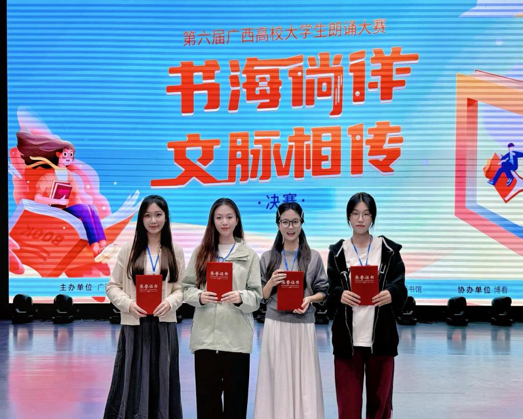 近日,由广西高教学会图书馆专业委员会、广西高校图书情报工作指导委员会举办的第六届广西高校大学生朗诵大赛决赛在桂林医学院举行。我校的谢孟庭、赵思彤、曾嘉甜、周晨同学联合朗诵的作品《大山里的光》荣获高职高专组三等奖;邓秋晓老师荣获优秀指导老师奖。