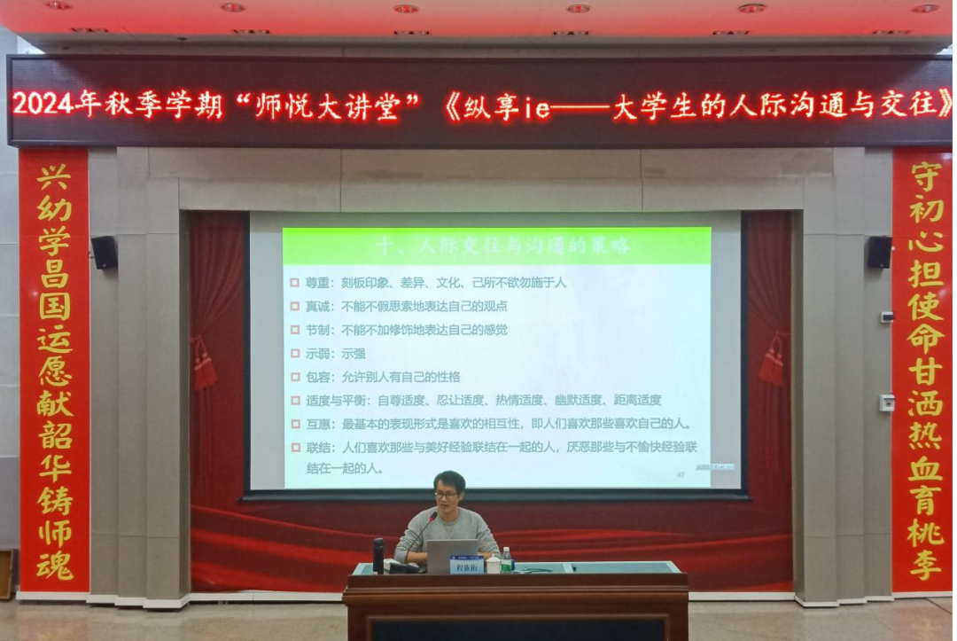 为普及心理健康教育知识,提高大学生人际交往与沟通能力,近日,我校举办2024年秋季学期“师悦大讲堂”之大学生文化素质教育系列讲座第二讲。讲座邀请北部湾大学程族桁教授担任主讲。我校近200余名师生现场聆听了讲座。