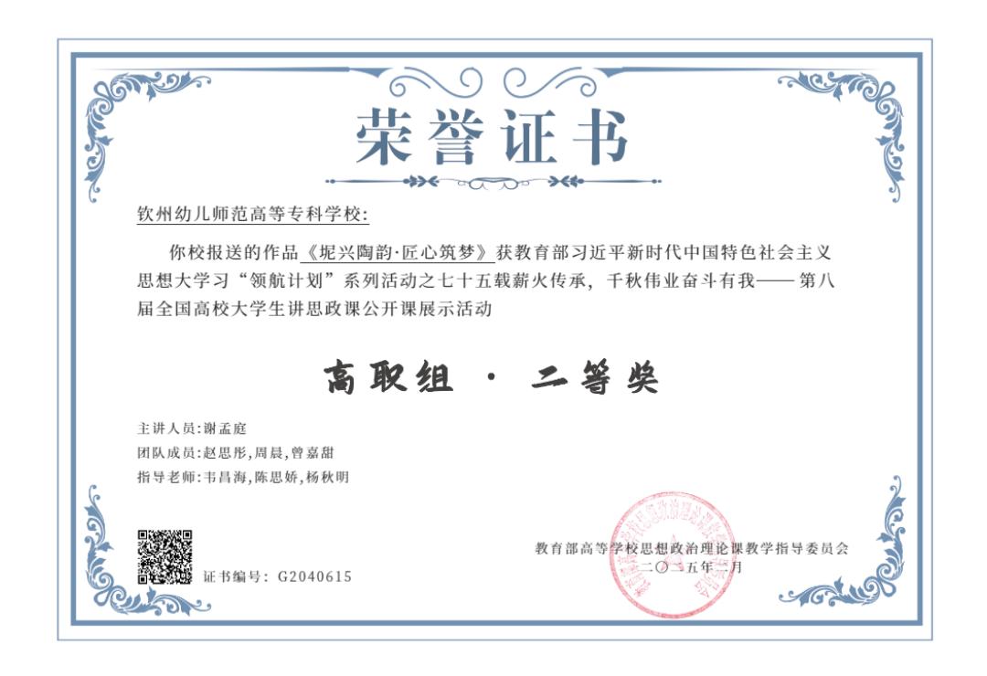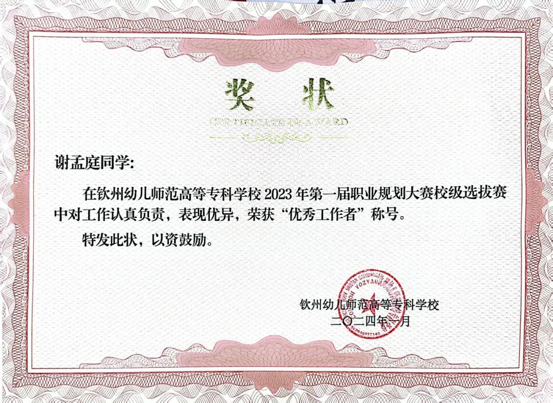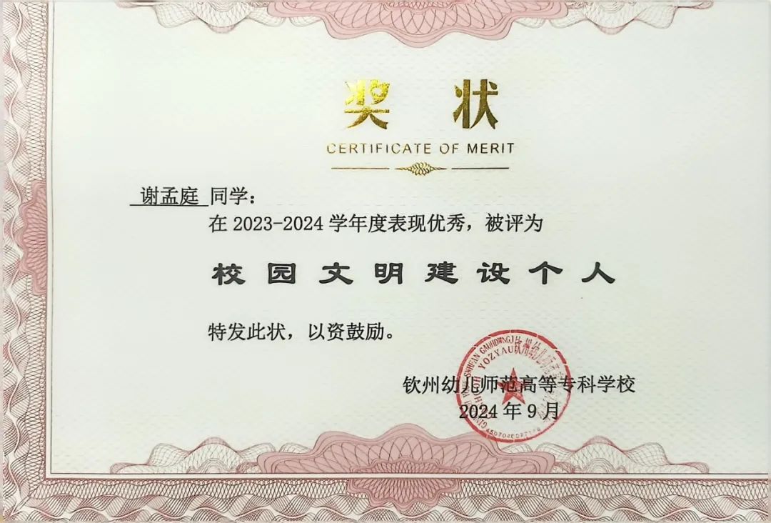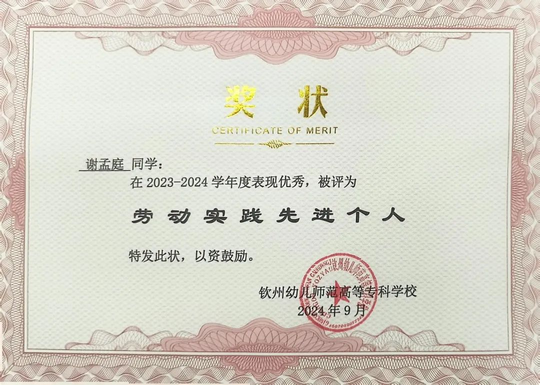谢孟庭,女,共青团员,钦州幼儿师范高等专科学校学前教育学院学生。在校期间,她以优异的表现和全面的素养脱颖而出,先后担任班级副班长、钦州幼专2024年“青年马克思主义者培养工程”培训班班长、校团委学生副书记、校园之声广播站站长、礼仪社组织部部长等职务。凭借突出的领导力与奉献精神,荣获校级“优秀学生干部”“校园文明建设个人”“三好学生”“最美钦幼学子”等多项荣誉称号。在学业上始终保持优异成绩,荣获国家奖学金;曾代表学校参加多项区级比赛并屡创佳绩,包括全国高校大学生讲思政课公开课展示活动二等奖、广西高校大学生朗诵大赛决赛高职高专院校组三等奖、广西职业院校技能大赛幼儿教育技能赛项银奖等,展现了新时代青年学子的风采。