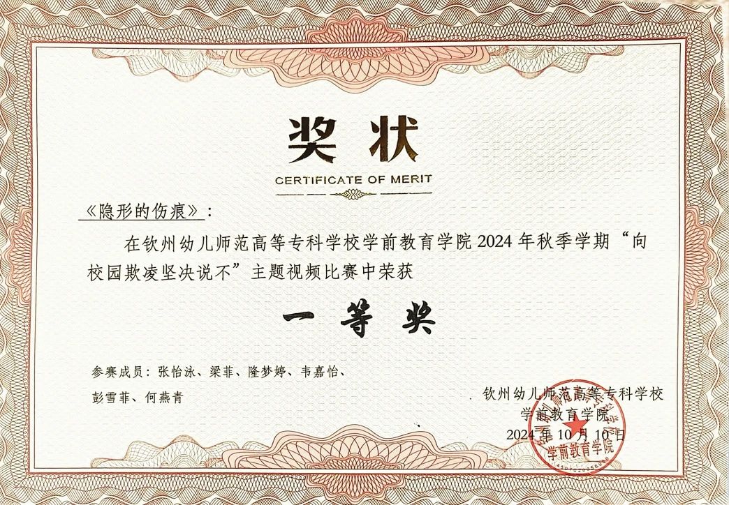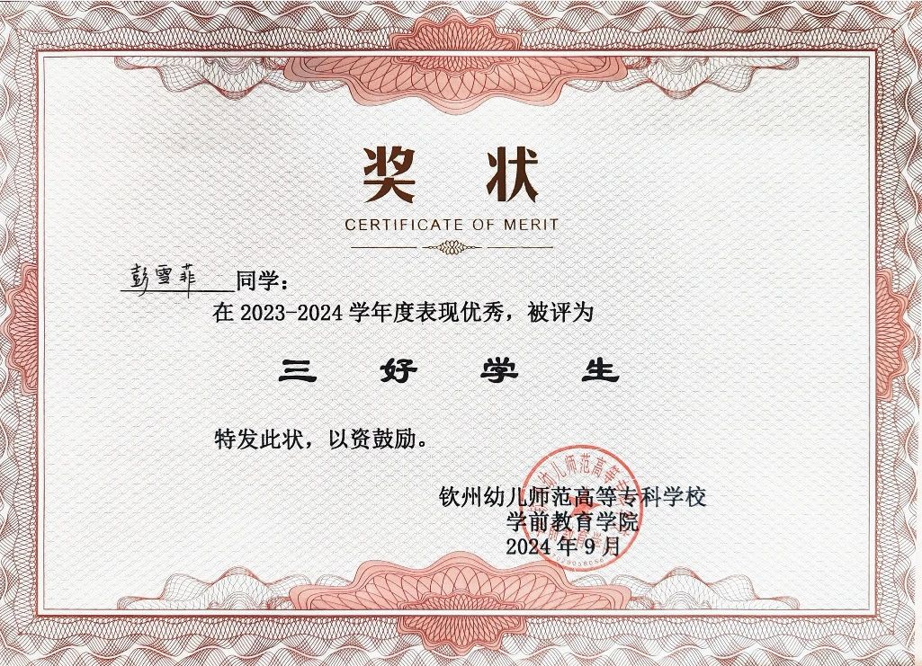 彭雪菲,女,共青团员,钦州幼儿师范高等专科学校学前教育2023级08班学生,现任学前教育学院分团委学生会办公室副部长、班级纪律委员,在校期间,她还参加勤工俭学,担任学前教育学院教学教辅一职。她凭借扎实的专业知识和不懈努力,先后荣获2023-2024年度国家励志奖学金,校级三等奖学金,院级三好学生、先进个人、幼儿舞蹈基本功大赛一等奖、微电影视频比赛一等奖、幼儿技能大赛二等奖、职业规划大赛二等奖、幼儿话剧大赛二等奖等荣誉。