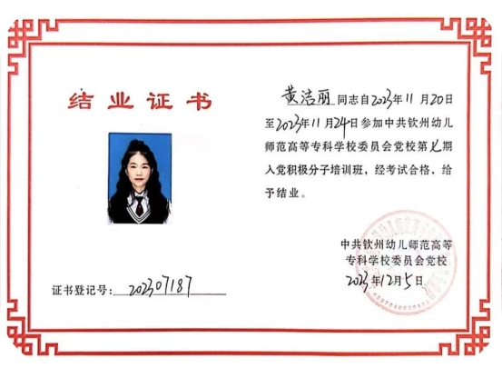 入校之后,黄洁丽同学始终积极向党组织靠拢,认真学习党的理论知识,踊跃投身各类党团活动。她始终在思想上行动上与党中央保持高度一致,不断汲取党的理论知识,提升自己的思想觉悟。大一第一学期,她便主动向党组织递交入党申请书,通过系统学习和严格考核,成为了党校第七期入党积极分子。