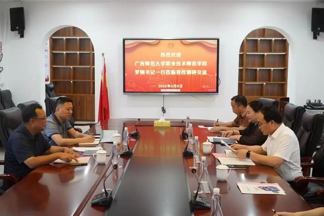 5月9日,广西师范大学职业技术师范学院党委书记罗钢以及罗军老师一行到我校调研交流,并举行座谈会。学校党委副书记、校长陈鹏,副校长邓秋晓出席会议,科研处、产教融合中心等部门有关同志参加座谈会。
