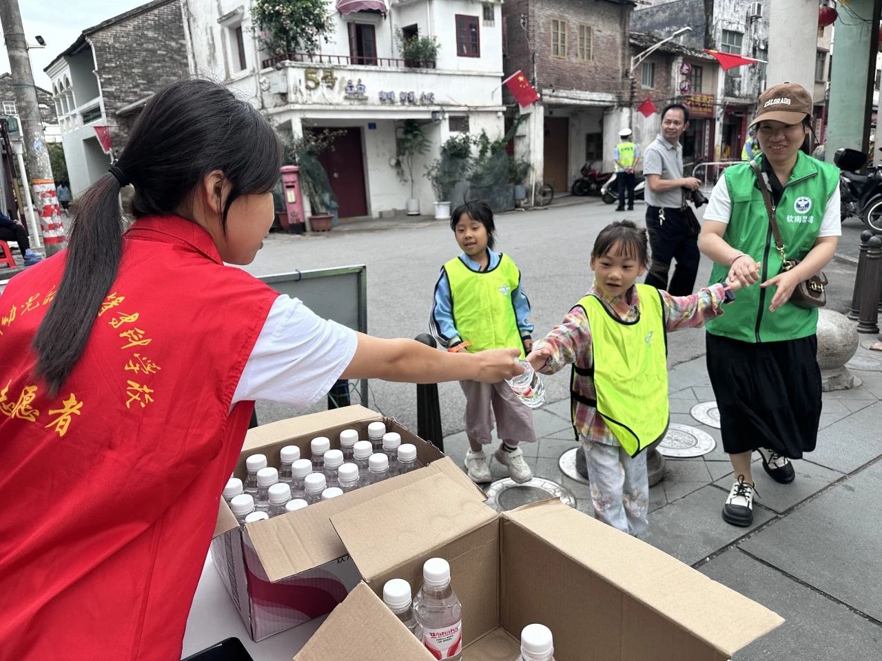活动当天清晨6点30分,我校青年志愿者集结出发,奔赴各自的服务岗位,以高度的责任感和使命感投入工作,提供引导、咨询和安全保障服务。负责打卡任务的志愿者,提前准备好背篓、绣球、手抄报彩笔、拼图等道具,活动中热情引导参赛亲子家庭,耐心讲解游戏规则、玩法,解决一些突发小状况。负责引导疏散的志愿者,在各打卡点周边手持指示牌,清晰指引A、B路线行进方向,时刻关注人流密度,及时疏导聚集人群,并通过对讲机保持点位间沟通,保障人流有序。在途经中山路、靖海路等关键路段时,志愿者们时刻关注着大家的安全,提醒过往车辆注意避让。