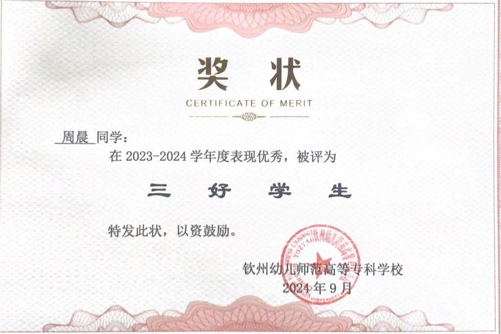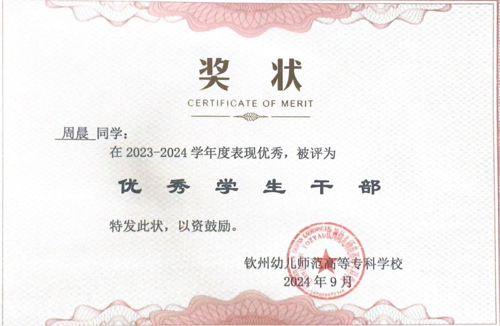在高中阶段对人文领域的深度思考后,我就确定了中文教育的职业航向,坚信语文教师是"灵魂的筑梦师",以汉字为砖瓦构筑思维宫殿,用诗文为钥匙开启审美疆界。2023年的那个夏天,我怀揣着对中文的兴趣与热爱,成功考入了钦州幼儿师范高等专科学校中文专业。入校以来,我时刻严格要求自己,思想上积极进取,乐观向上;学习上谦虚谨慎,刻苦勤奋;工作上主动热情,认真负责。在老师的悉心教导下,我收获颇多,学习成绩排在专业前列,荣获国家励志奖学金等众多奖项,还顺利考取了英语B级等证书,并且从一名毫无管理经验的普通学生成长为得到老师同学都认可的优秀学生干部。