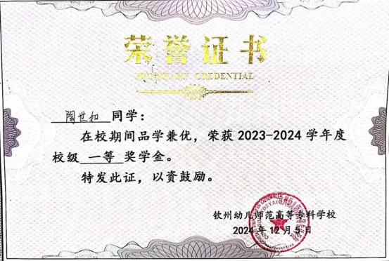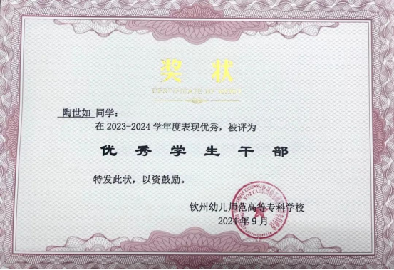 陶世如,女,共青团员,钦州幼儿师范高等专科学校学前教育2023级28班学生,现任钦州幼儿师范专科学校校团委国旗护卫队副队长、班级体育委员,钦州幼专2024年“青年马克思主义者培养工程”学员。在校期间,她还参加勤工俭学,担任学前教育学院教学教辅一职。她凭借扎实的专业知识和不懈努力,在学业上始终保持优异成绩,先后荣获2023-2024年度国家励志奖学金,校级一等奖学金,校级“三好学生”、“优秀学生干部、“最美钦幼学子”、“校园文明建设个人”、“劳动实践先进个人”、学院幼儿“儿歌表演唱”基本功大赛特等奖、“幼儿故事讲述”比赛一等奖、幼儿技能大赛一等奖、大学生“学问杯“影评大赛“一等奖”、职业规划大赛二等奖、“幼儿舞蹈”三等奖等荣誉,展现了新时代青年学子的风采。