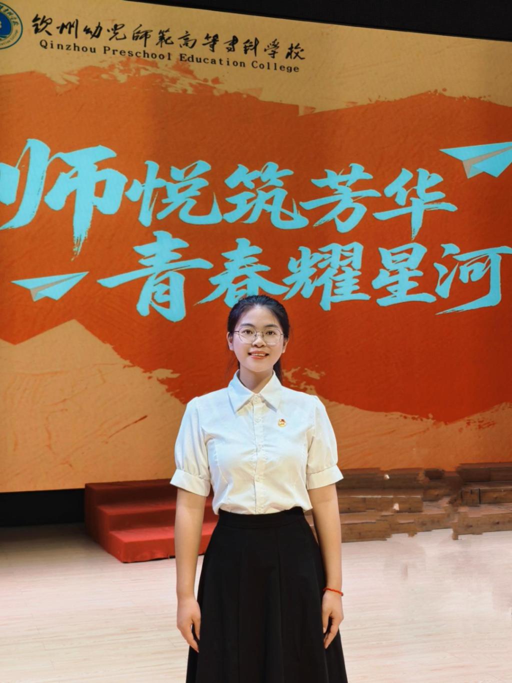 朱杰婷,女,中共预备党员,体育与艺术学院音乐教育专业23级4班学生。曾担任钦州幼儿师范高等专科学校学生会副主席、2024年“青年马克思主义者培养工程”培训班组织委员、音乐教育专业23级4班学习委员;曾荣获2024年度广西壮族自治区人民政府奖学金、第十二届“挑战杯”广西大学生课外学术科技作品竞赛三等奖、校级宣传思想工作先进个人、优秀青年志愿者、优秀学生干部、三好学生、最美钦幼学子、校园文明建设先进个人、劳动实践先进个人等荣誉称号。