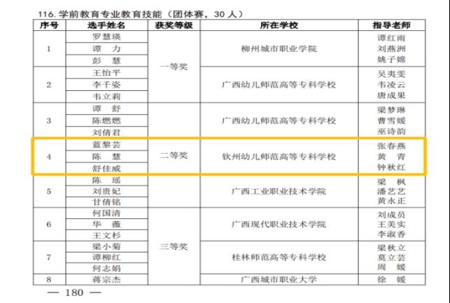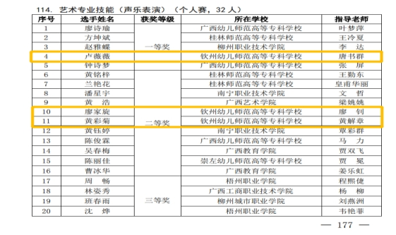 我校“赛训结合”的教学技能训练模式取得了可喜的成绩,2022年3月学前教育专业学生参加全区职业院?!把敖逃ㄒ到逃寄堋比?,获团体二等奖1个,音乐教育专业学生参加全区职业院?!吧旨寄堋比罨褚坏冉?个,二等将2个;2022年5月组织学生参加自治区师范生教学技能大赛学前教育专业获一等奖1个,美术教育专业获二等奖1个;2022年5月组织学生参加全区师范生信息化教学应用大赛获一等奖1个,二等奖6个,三等奖9个;2022年11月组织学生参加第三届“幼乐美杯”全国职业院校早期教育专业保教技能竞赛获三等奖1个,组织参加首届东盟幼儿照护大赛获三等奖1个。通过比赛,强化了各专业技能训练,以赛促教、以赛促学、以赛促改,提升教学创新与课程改革的成效。