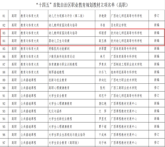 2021—2022学年度,通过自治区教育厅审核立项建设十四五规划2门教材《幼儿教师家园沟通与指导》《婴幼儿卫生与保健》。