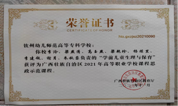 学校坚持以立德树人为导向,推进课程思政教育教学改革,探索知识传播、能力培养与价值引领同频共振的有效途径,充分发挥课堂教学主渠道在高校思想政治工作中的作用,使思想政治教育贯穿人才培养全过程。2021年建成自治区级课程思政示范课程《学前儿童生理与保育》,2022年建成自治区级课程思政示范课程《幼儿教师口语》。