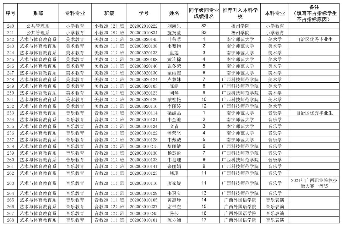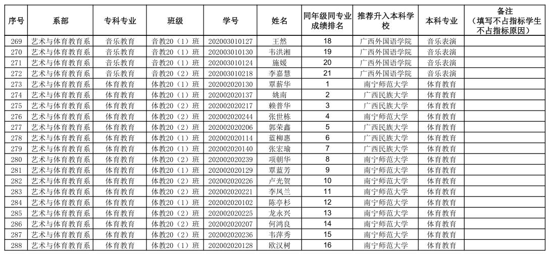 根据《自治区教育厅关于做好2023年全区普通专升本招生工作的通知》(桂教高教〔2023〕12号)文件精神以及《钦州幼儿师范高等专科学校2023年高职高专应届毕业生升本选拔工作实施细则》(钦幼专报〔2023〕14号)文件要求,本着公正公平的原则,按照推荐条件和程序,经学生个人自愿申报、系部选拔推荐、教务处审核、学校专升本工作领导小组审定,拟推荐农锦妮等288名学生升入本科学习。