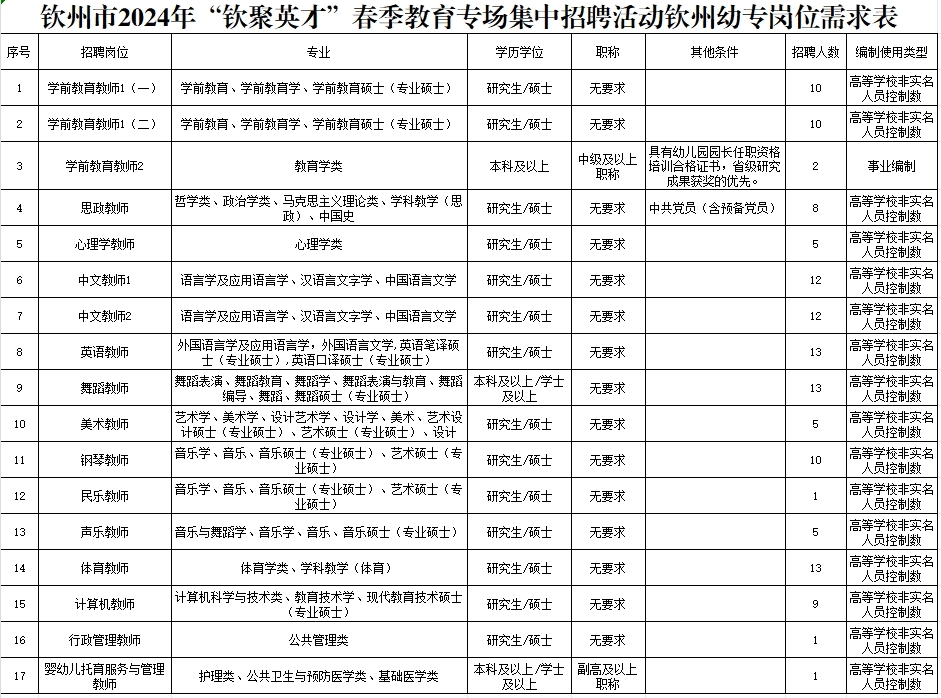 招聘日程安排、程序和方式等具体事宜详见《钦州市2024年“钦聚英才”春季教育专场集中招聘公告》。