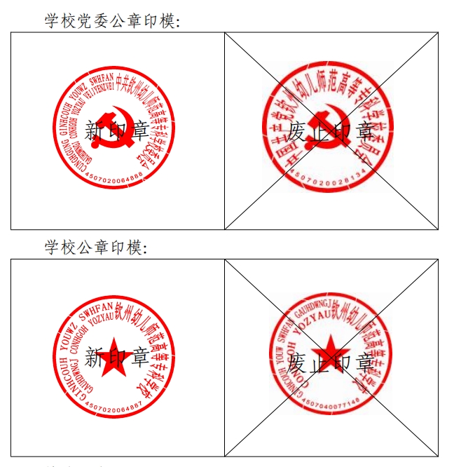 三、请各相关单位及时知悉并更新我单位公章信息,避免因公章更换造成不必要的误解与损失。如有任何疑问,请及时与我单位联系,联系电话:0777-2596888,办公地址:广西钦州市钦南区西环南路89号,钦州幼儿师范高等专科学校,综合楼703室。