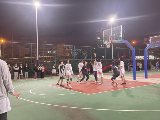 在赛场上球员们积极投入、全力以赴,每一次的运球、转身、变向、上篮都展示了球员们努力拼搏的精神,点燃了现场的火热气氛。在场外的啦啦队也不遗余力地为球员们加油助威!在比赛过程中,裁判员严肃认真地判决好每一个球,保障了比赛的公平、公开、公正。