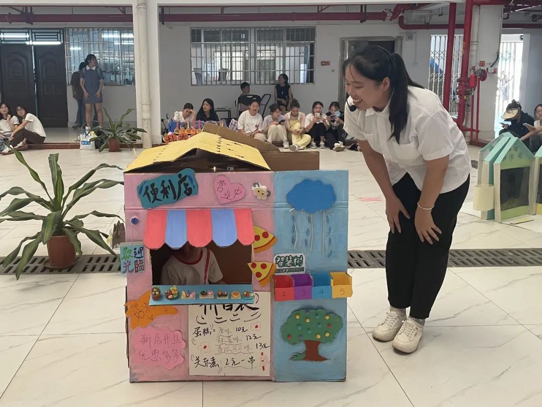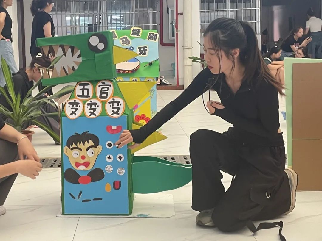 比赛中,选手们按班级顺序展示自己的作品,分别从作品名称、设计目的、使用材料、使用功能、教育价值等方面详细解说自制的幼儿园玩教具,并进行现场操作示范。从材料上看,大部分同学选择了低结构废旧材料,不仅符合当前的环保理念,也方便收集,一个个纸壳箱、矿泉水瓶盖、泡沫板、光碟、纸盘等经过同学们的“奇思、巧手”变成了孩子们爱不释手的玩具。其中作品《奇妙的声音之旅》使用各种生活常见的器具为主要元素,通过击打、摇晃可以制造出各种不同的声音;《皮影小剧场》创意十足,薄透的幕布背后充满神秘感,展示了传统文化的魅力;《奇幻妙妙》是一个手工售卖屋造型,富有新意,功能多样,可以让幼儿通过角色扮演体验生活;《过年啦》以中国传统文化春节的元素为主、巧妙的与国歌的介绍、各类益智游戏结合展示,突出了玩教具的思政价值......各组参赛玩教具构思巧妙、造型新颖,给在场的师生留下了深刻印象。