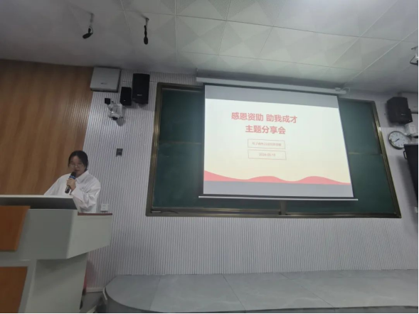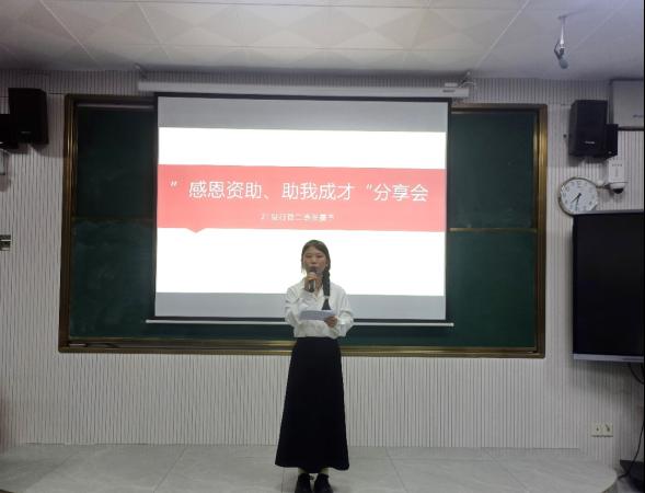 2022级应用英语专业2班的陈舒媛同学从“获奖背景与心情”“资助助力个人全面发展”“学会感恩、回馈社会”“未来规划”等方面介绍了自己的成长经历。她建议同学们要有爱国主义精神和集体荣誉感,认真学习党的有关理论知识,不断提高自身思想认识水平;要以资助为动力,更加刻苦求学,不断提升自己的知识水平和专业技能;要以诚待人,与同学们和睦相处,互帮互助;要勤俭节约,做一名艰苦朴素的大学生。