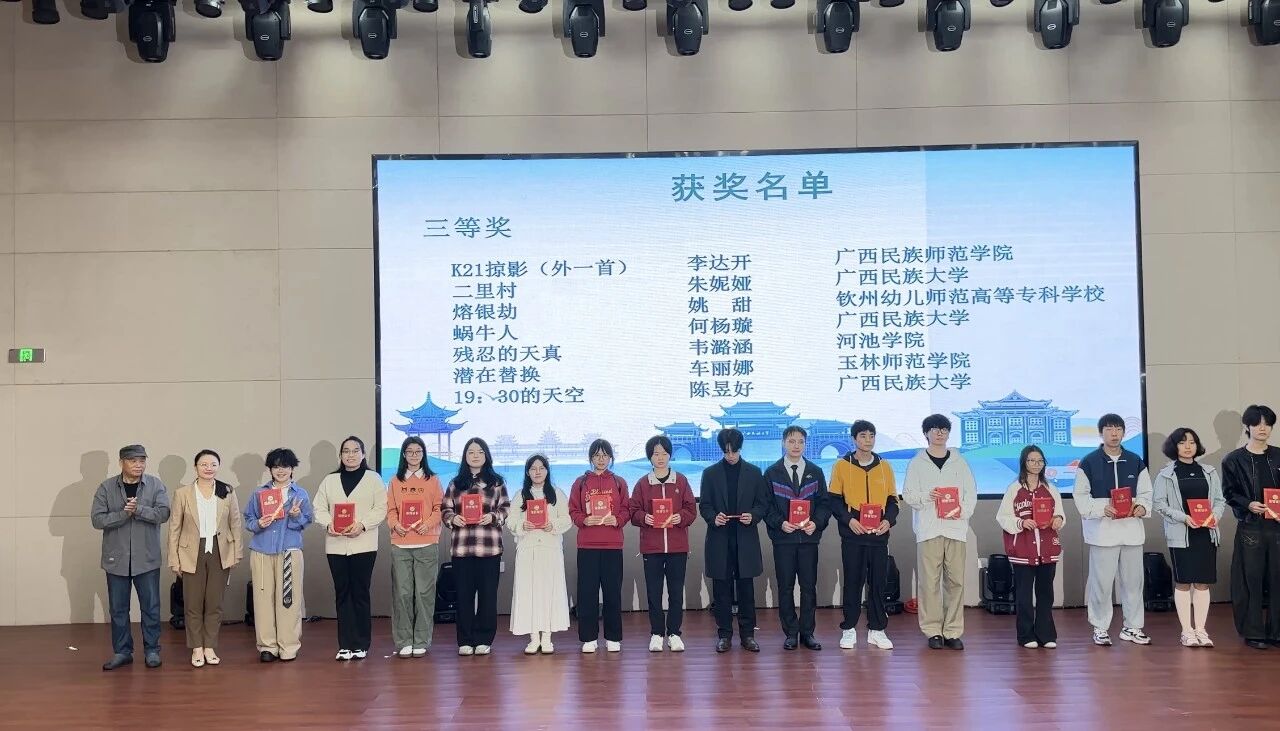 据悉,本次大赛是由广西民族大学、广西作家协会主办。大赛主题、题材不限,自2025年3月27日启动,7月8日截稿,共有全区35所高校参与比赛,收到参赛稿件共三千余篇(首)。经东西、凡一平、张柱林、陈爱中、小昌等评委老师严谨认真的评审,最终产生一等奖2篇,二等奖6篇,三等奖15篇和优秀奖20篇,共计43篇获奖作品。