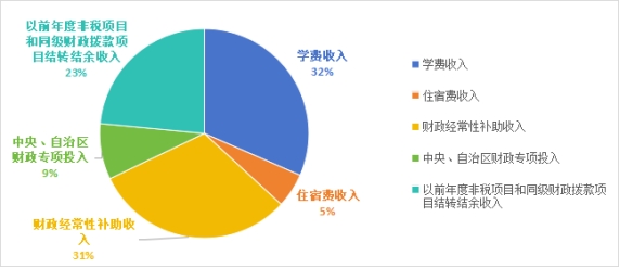 近三年来,随着学校不断扩大发展,学校的办学经费从2021年的5,764.42万元增长到2023年的12,128.47万元,增长110.40%,为学校教育事业发展提供了有力保障。2023年总收入12,128.47万元。其中:学费收入3,826.08万元,全部为一般公共预算返还学费收入。住宿费收入645万元,全部为一般公共预算返还住宿费收入。财政经常性补助收入3,762.55万元,全部为财政拨款定额基本支出收入。中央、自治区财政专项投入1,046.43万元,全部为财政拨款项目支出收入(含上年项目支出结转和结余343.83万元)。以前年度非税项目和同级财政拨款项目结转结余收入2,848.41万元(其中:以前年度非税项目结转和结余收入564.45万元,同级财政拨款项目结转结余收入2,283.96万元)。
