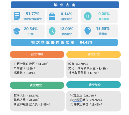 学校目前有学前教育学院、儿童早期发展学院、体育与艺术学院、人文与管理学院、继续教育学院等5个二级学院??栌醒敖逃?、早期教育、婴幼儿托育服务与管理等12个专业。今年秋季学期在校生为8053人。学校长期致力于培养幼儿教师、中小学紧缺学科教师以及符合北部湾地区经济社会发展急需的技术技能型人才。