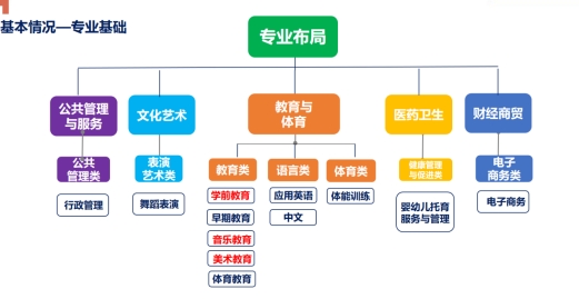 学校坚持“幼”字特色和“师范”属性,以“师范教育专业为主体,适度发展非师范类专业”为专业建设思路,一以师范教育为主体,充分发挥学前教育和艺术师范教育优势,凸显幼儿师范教育特色,形成以学前教育为核心,早期教育、婴幼儿托育服务与和管理、音乐教育为支撑的学前教育专业群;二对接区域经济社会及产业需求,科学设置如电子商务、中文、行政管理、应用英语等非师范类专业。学校现形成教育与体育、文化艺术、财经商贸、公共管理与服务、医药卫生五个大类共设有学前教育、音乐教育、体育教育、行政管理、电子商务、应用英语、婴幼儿托育服务与管理、舞蹈表演、中文、体能训练等12个专业的专业布局。