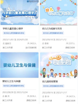 2023年,学校共开设各类课程318门,共计学时17695。学校积极推进现代信息技术与职业教育教学深度融合,努力打造精品课程,促进优质教育资源应用与共享,满足学生多样化学习的需求。2023年,我们学校以自治区示范专业及实训基地项目建设为契机,完成了学前教育专业4门校级在线精品课程《婴幼儿卫生与保健》《幼儿心理学》《幼儿行为观察与分析》《幼儿园班级管理》的建设,并于2023年3月初上线开课;音乐教育专业正在建设4门精品课程《声乐》《钢琴》《乐理与视唱练耳》《小学音乐教育设计》,美术教育立项建设3门精品课程《中国画》《儿童手工》《书法》,婴幼儿托育服务与管理专业立项建设3门精品课程《婴幼儿游戏活动实施》《婴幼儿回应性照料》《婴幼儿家庭教育与指导》。