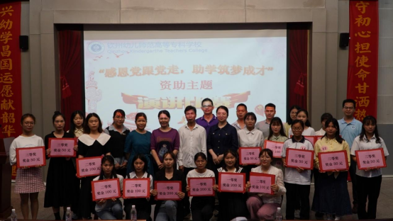 主持人宣布“感恩党跟党走,助学筑梦成才”演讲比赛圆满结束,嘉宾评委和获奖选手同台留影合念。