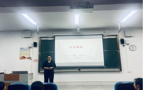 劳崇谊老师的讲座,以毛泽东的《七律?长征》一诗引出主题,讲述了长征精神的形成背景、历史回顾、精神内涵和伟大意义四个方面内容。