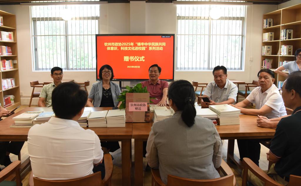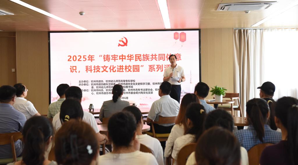 为深入贯彻立德树人根本任务,全面提升师生综合素养,坚定文化自信,铸牢中华民族共同体意识,近日,我校与市政协联合举办的“铸牢中华民族共同体意识,科技文化进校园”系列活动在图书馆举行。钦州市政协副主席黄球、林雪梅,市政协副秘书长农海飚,钦州幼儿师范高等专科学校党委书记卢红青、校长陈鹏、副校长邓秋晓、图书馆馆长赵莉莉出席了活动的启动仪式。