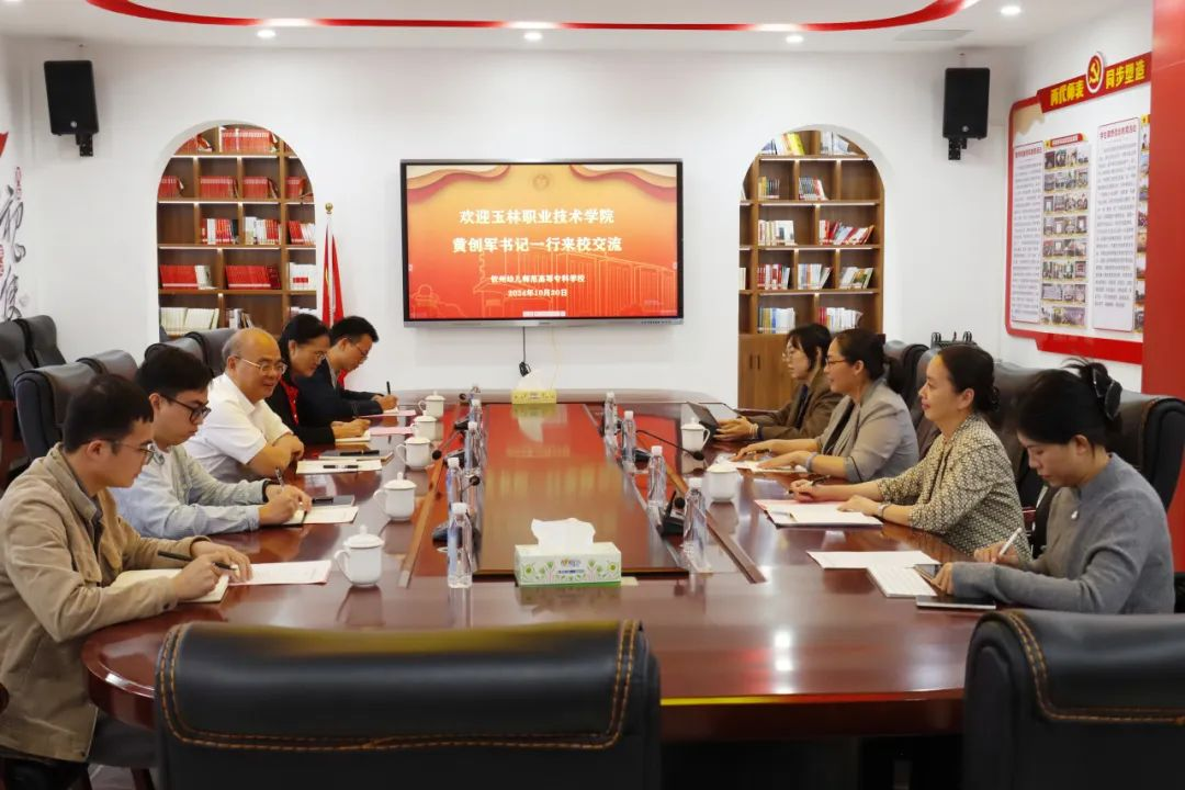 10月30日上午,玉林职业技术学院党委书记黄创军一行到我校开展考察交流活动。我校党委书记卢红青主持召开座谈会,校党委委员、副校长杨秋宇出席座谈会并陪同学习交流。两校相关职能部门负责人参加活动。Δ ?座谈会现场座谈会上,卢红青对黄创军一行的到来表示热烈欢迎,并围绕学校的基本概况、办学...